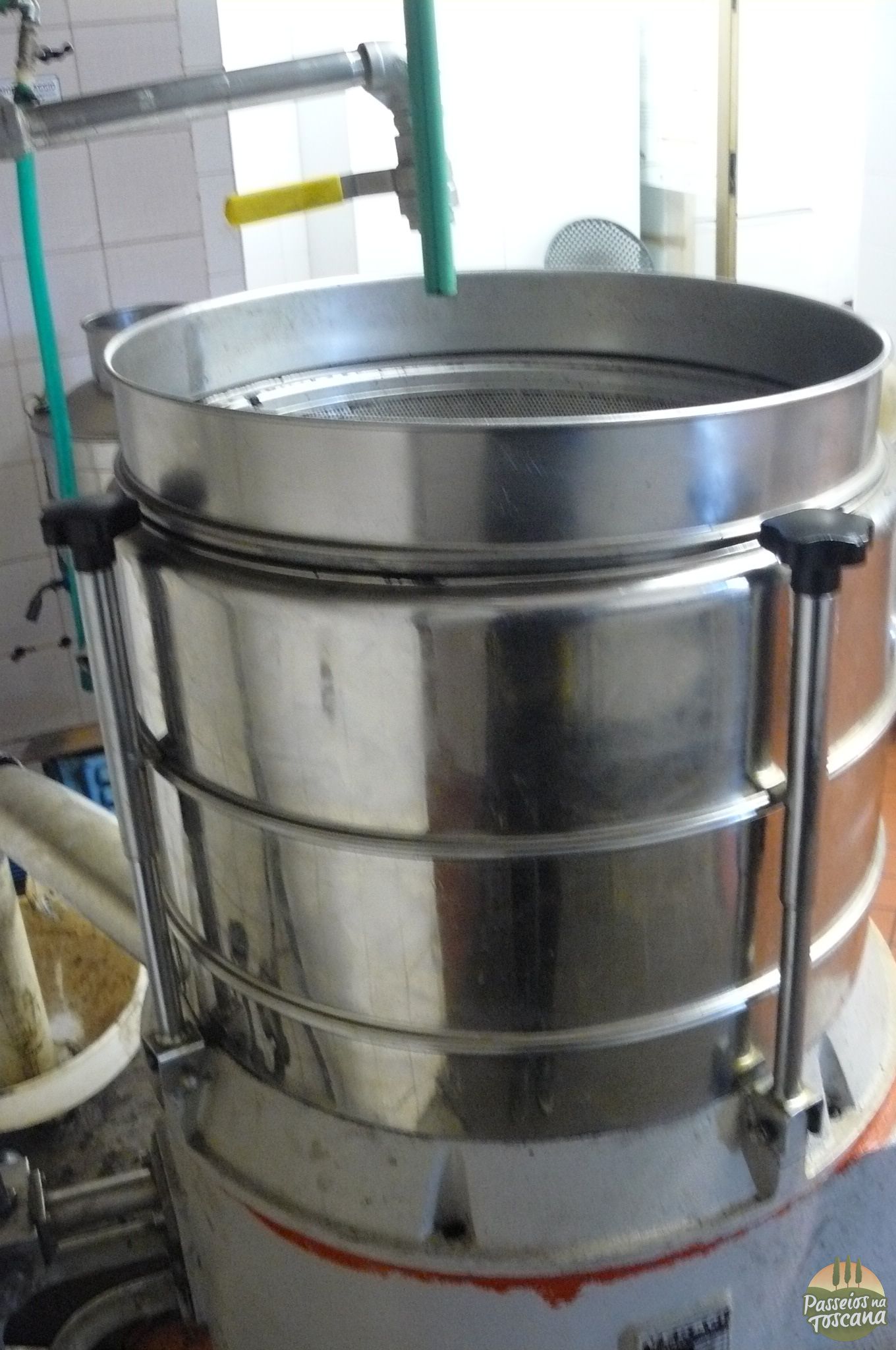 - spremitura – prensagem: Uma vez que a massa é “gramolata“, ela vai para um aparelho chamado de centrífuga, esta máquina é considerada o coração do Frantoio, e consiste na separação através do peso dos três componentes da pasta que são: água de vegetação, o azeite de oliva, e a chamada “sansa virgine” ou “bagaço virgem“. As duas primeiras substâncias são filtradas e separadas em dois recipientes diferentes, enquanto o “bagaço de azeitona” geralmente molhado e gorduroso é transportado para o lado de fora do edifício e levada à grandes transformadores para que se transforme em”olio di sansa“, “olio de bagaço” “material combustível usado em algumas usinas térmicas.