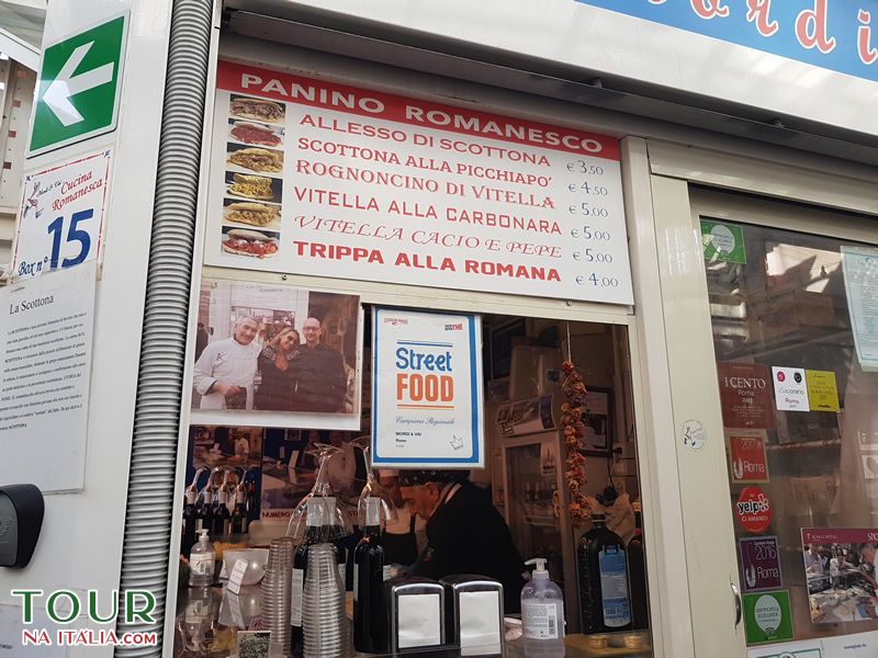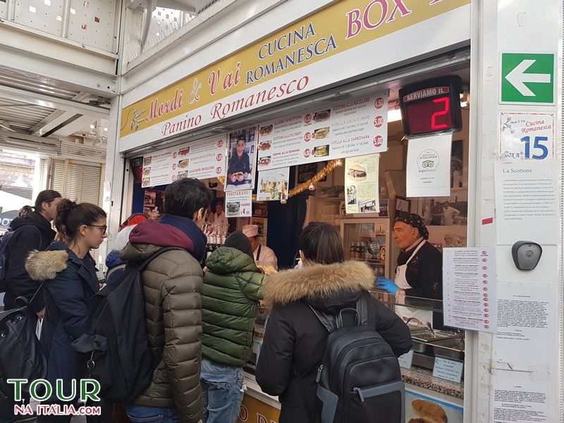 Em um dos cantos mais remotos do mercado você encontrará Mordi & Vai do Sergio Esposito. O Sergio trabalhou como açougueiro muitos anos, e depois que se aposentou, decidiu trabalhar de novo atrás do balcão, porém em sua loja de panini, com todas as carnes romanas típicas. Nesta loja ele vende todos os pratos típicos romanos famosos em um sanduíche. Você escolhe trippa ou coda alla vaccinara (rabo de boi), para a coratella (coração, pulmões e fígado) ou para polpette (almôndegas) de acordo com a receita da avó.