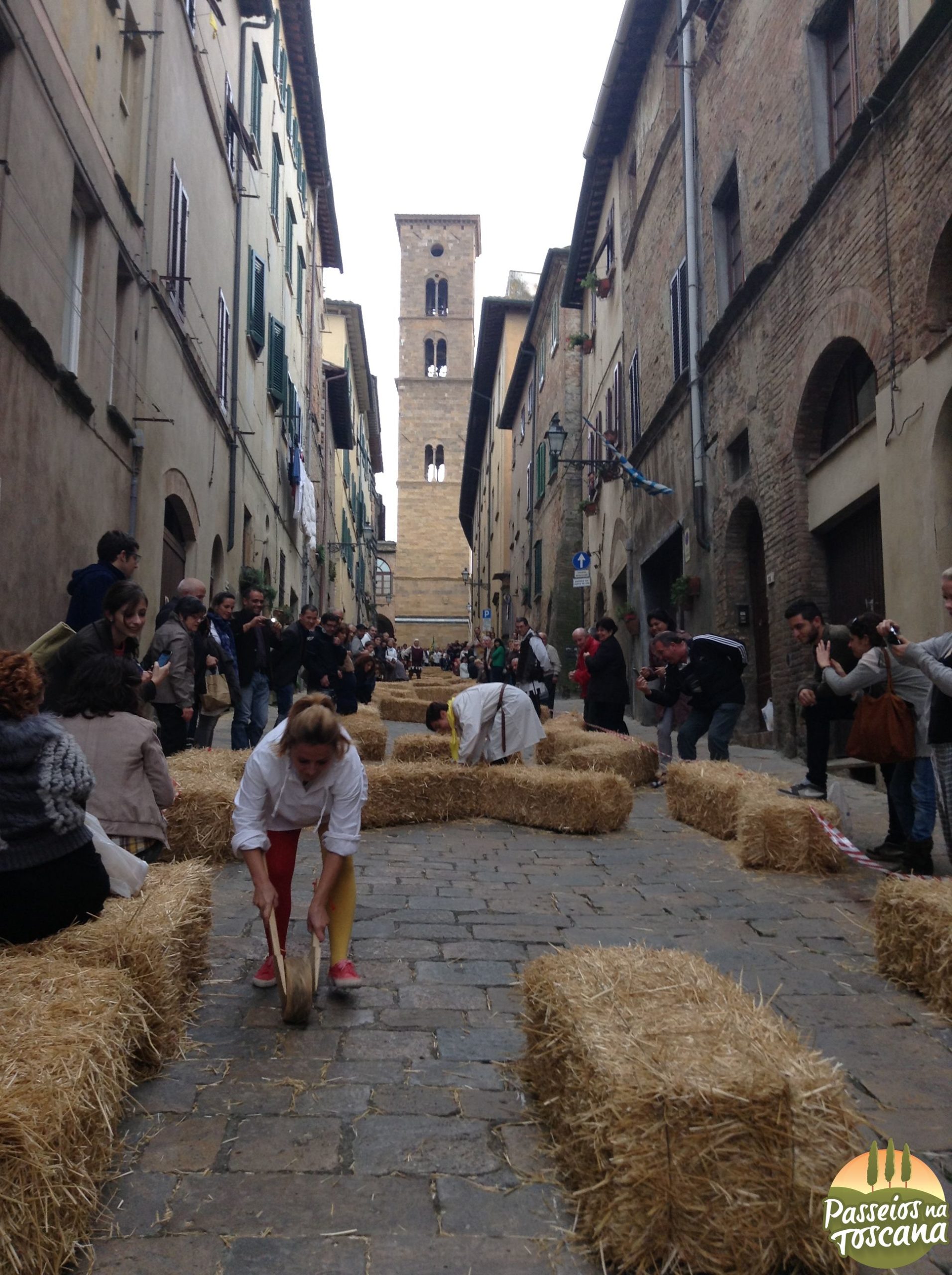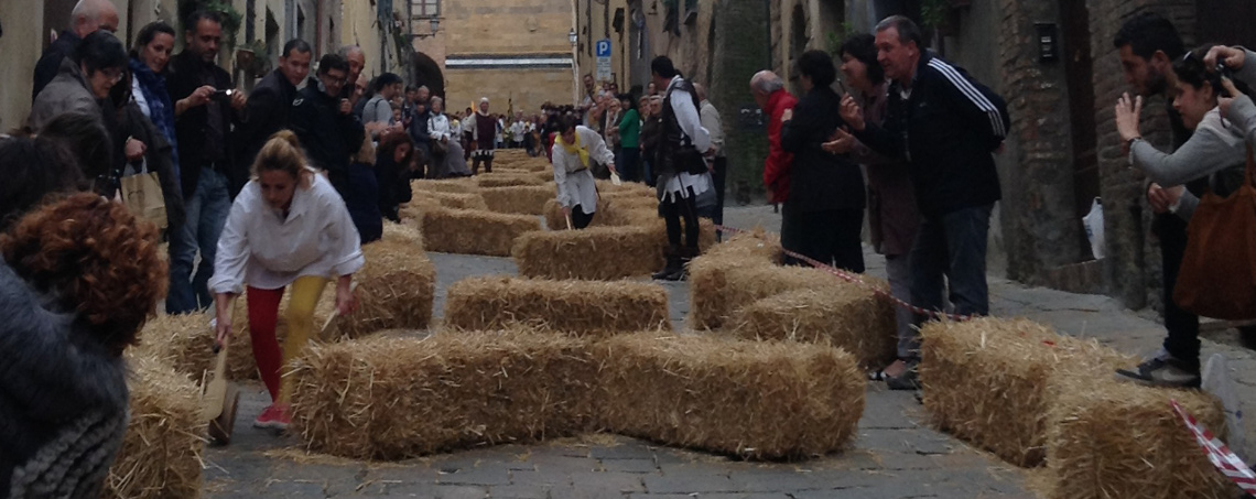 As contradas de Volterra, ou seja cada bairro ou paróquia, escolhe o seu “tiratore” ou jogador, que vai descer a Via Franceschini, enfrentando a obstáculos, e o primeiro a chegar com sua Cacciota (queijo) leva o Palio! E eles somente podem usar um pedaço de pau para poder movimentar o queijo. Em 2013 e 2014 quando eu assisti as competições, tiveram 3 mulheres.