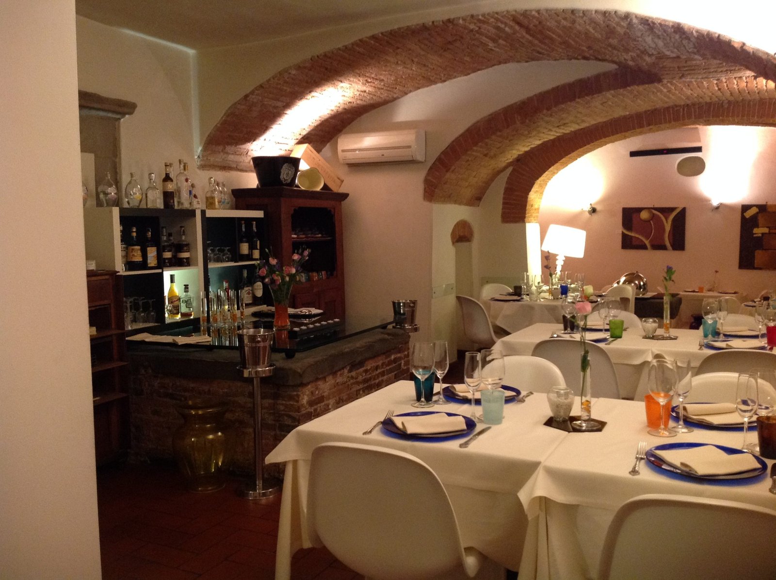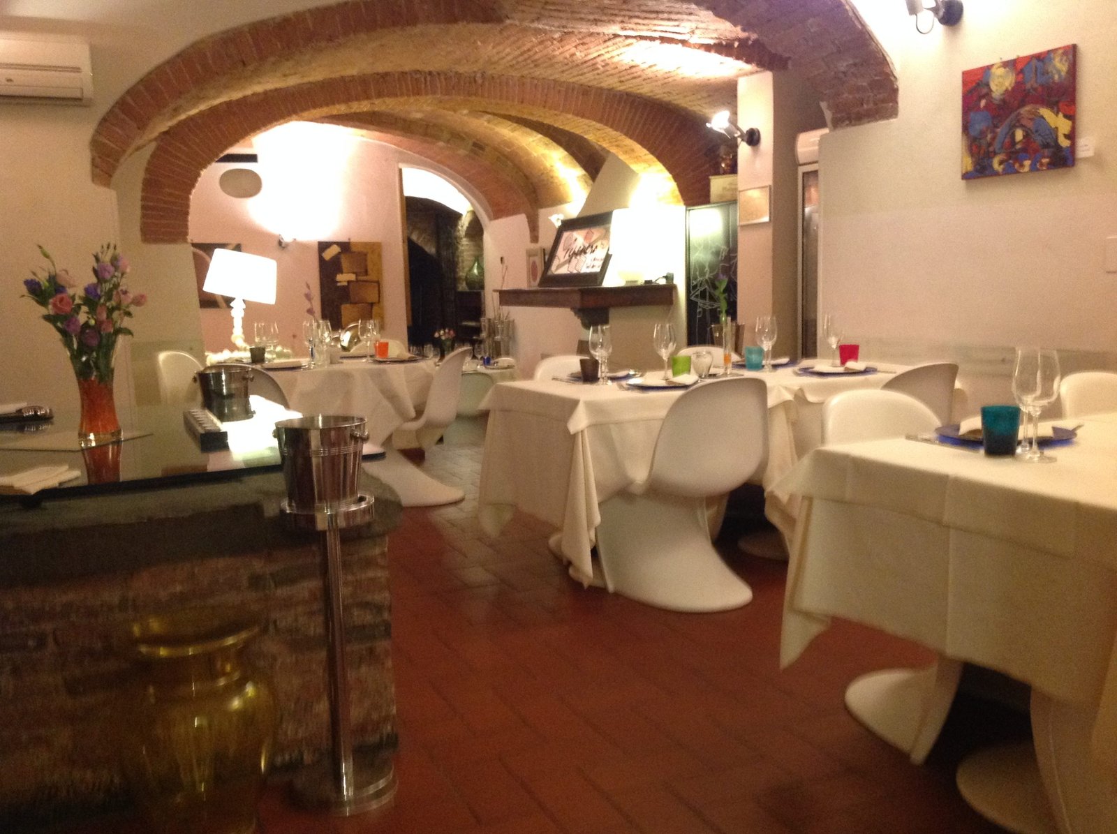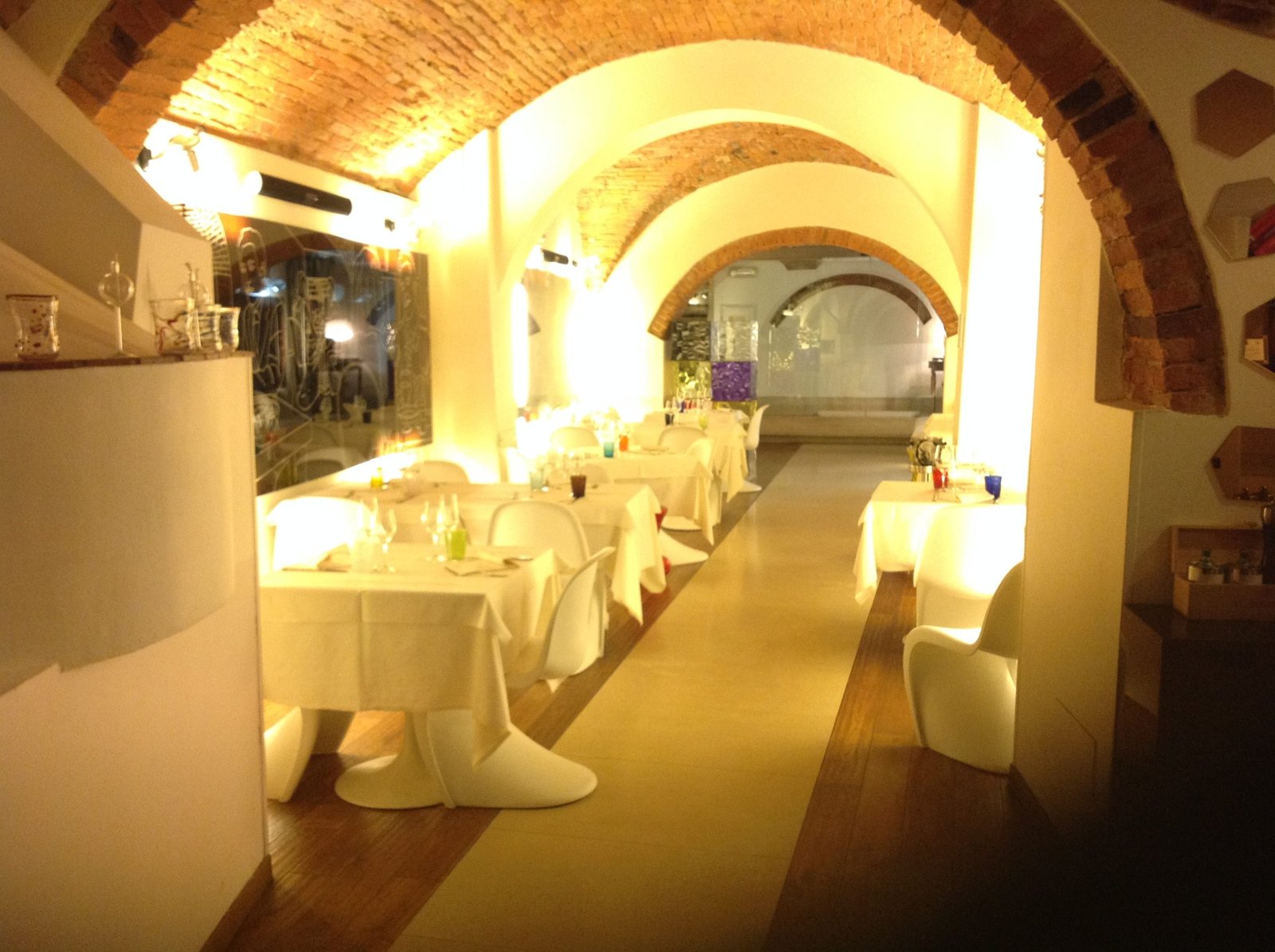 Os clientes são recebidos por uma grande entrada de vidro, de onde se pode ver as áreas de luz provenientes dos painéis gráficos em vidro temperado, nas mesas das salas são usadas toalhas de linho e cânhamo, copos e talheres de boa qualidade. Mobiliário de design : cadeiras Panton, uma homenagem maravilhosa para a famosa cadeira Zig Zag por Gerrit Rietvelt – que convive bem com os arcos de tijolos e pisos de carvalho escuro, tijolo e travertinos, música relaxante espalhada por toda parte por uma coluna musical assinada Bang & Olufsen.