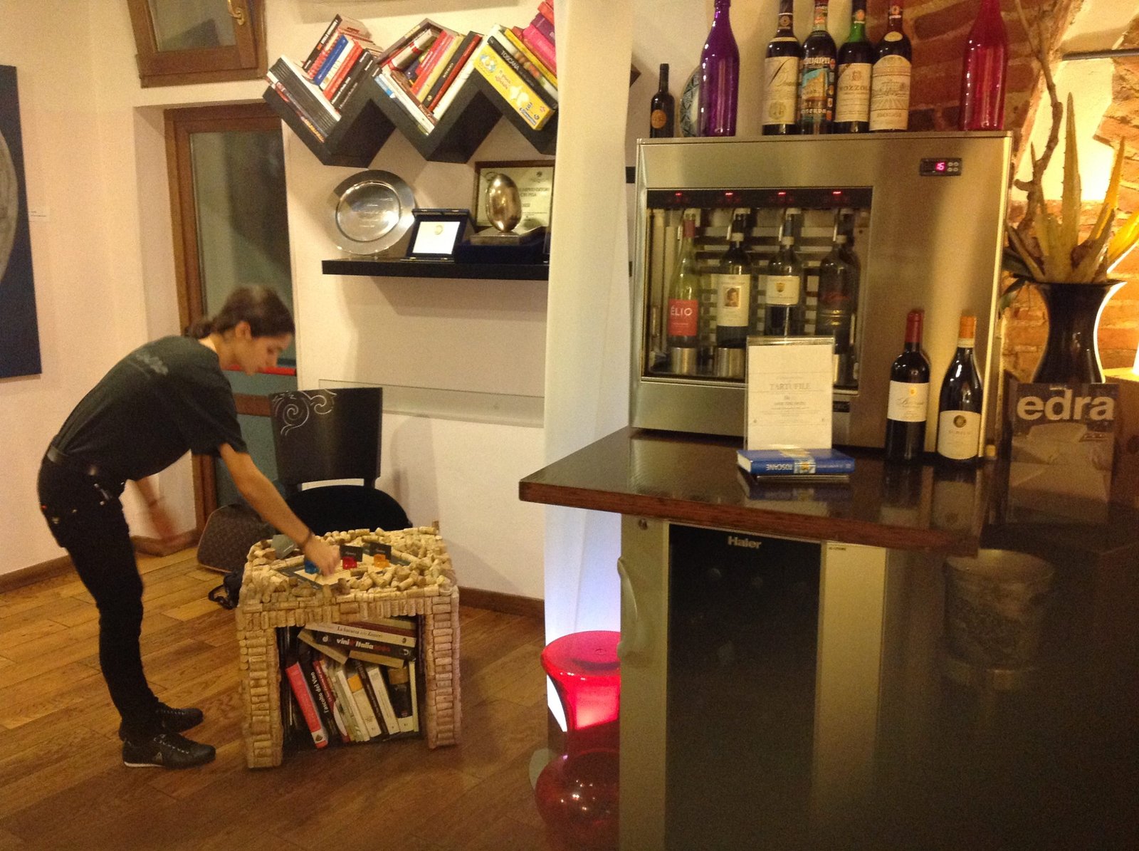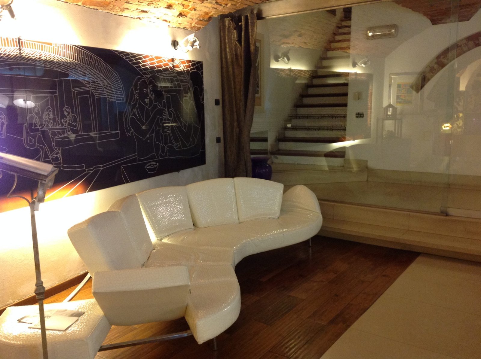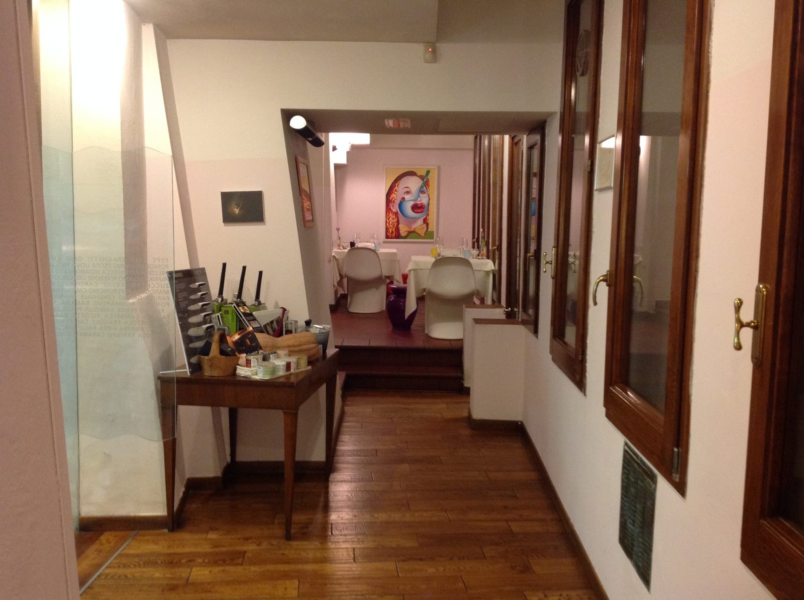 Os clientes são recebidos por uma grande entrada de vidro, de onde se pode ver as áreas de luz provenientes dos painéis gráficos em vidro temperado, nas mesas das salas são usadas toalhas de linho e cânhamo, copos e talheres de boa qualidade. Mobiliário de design : cadeiras Panton, uma homenagem maravilhosa para a famosa cadeira Zig Zag por Gerrit Rietvelt – que convive bem com os arcos de tijolos e pisos de carvalho escuro, tijolo e travertinos, música relaxante espalhada por toda parte por uma coluna musical assinada Bang & Olufsen.